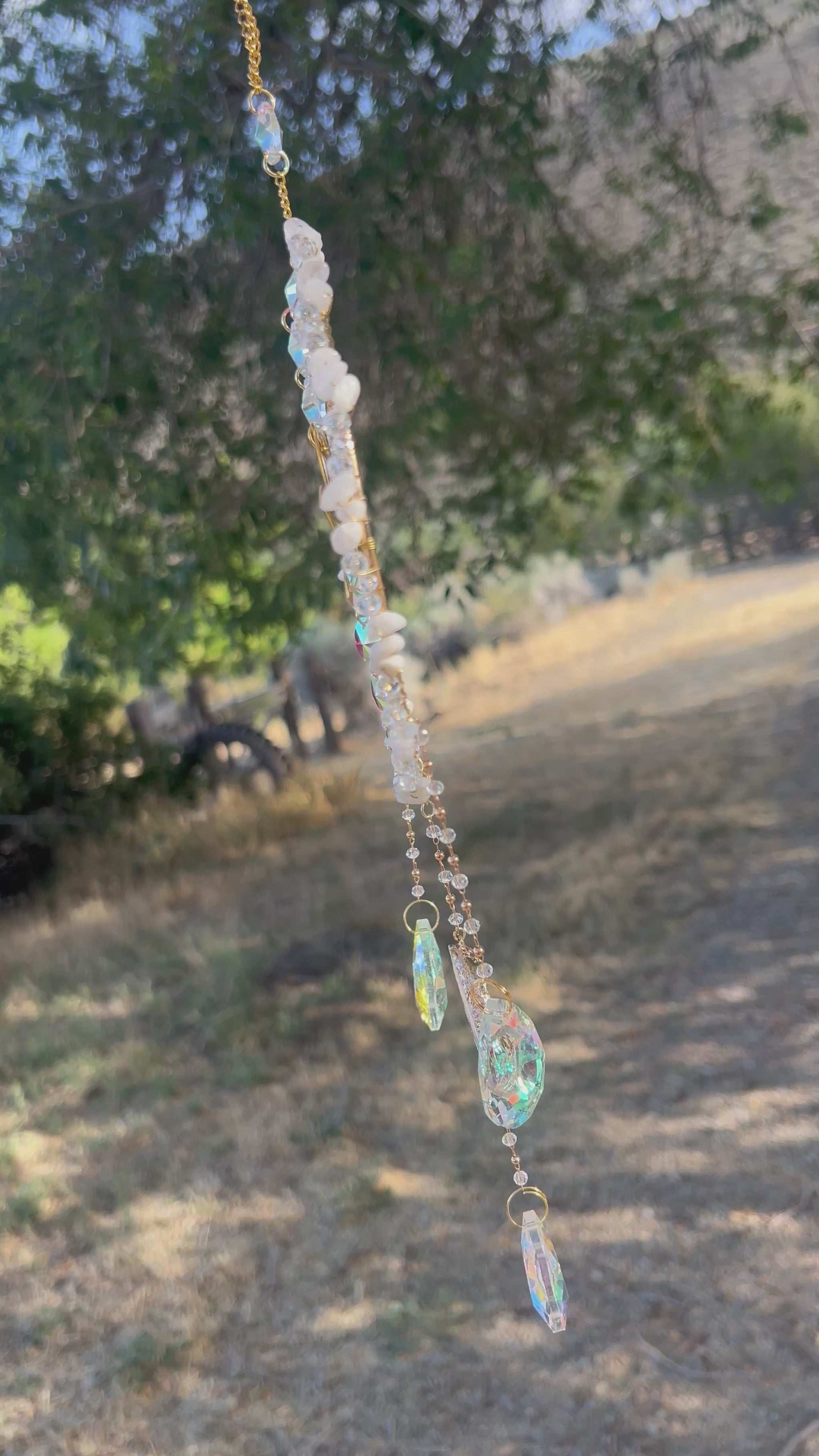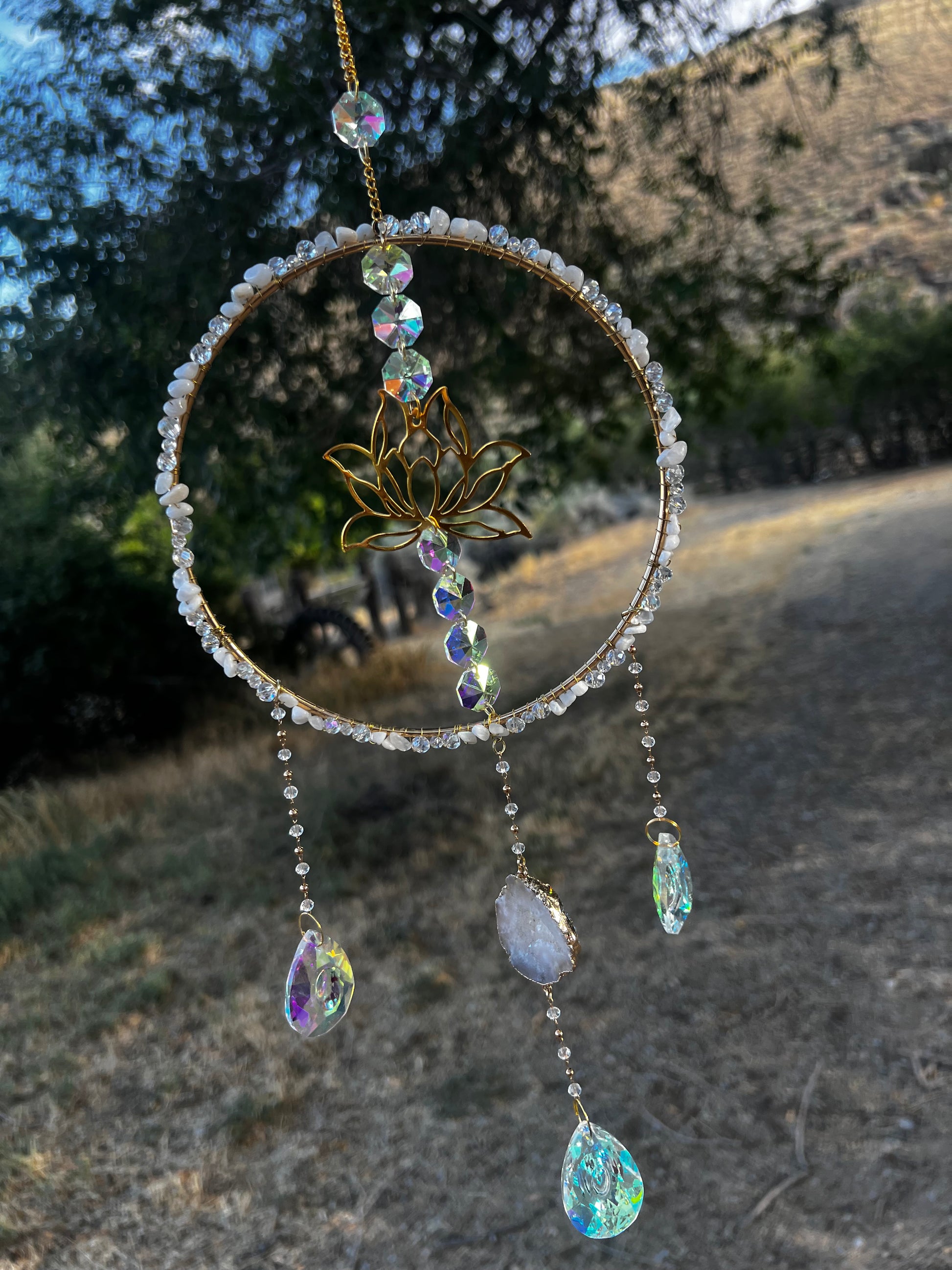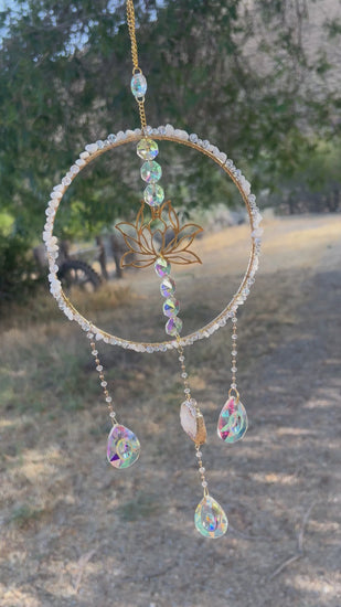 Meaning “gift of beauty,” Callidora is a gentle yet radiant suncatcher designed to awaken your inner light. A golden lotus blooms at the center, anchored by a shimmering rainbow moonstone that reflects intuition, emotional balance, and divine feminine energy. Wrapped in a halo of crystal and acrylic beads, this piece sparkles with ethereal elegance and spiritual clarity.