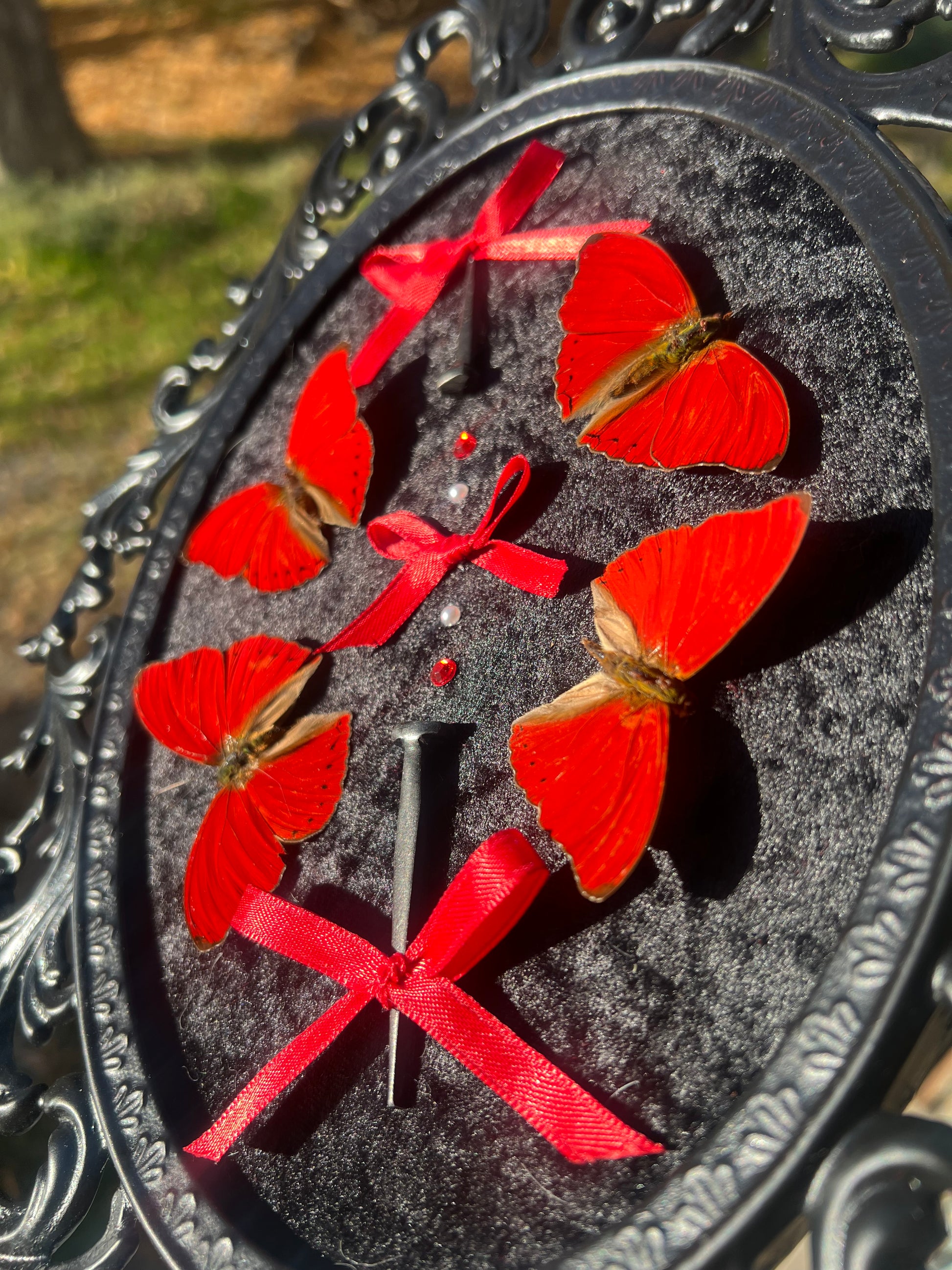 Crimson Queen is a statement piece for those who appreciate beauty with bite. Set inside an ornate black frame, this shadowbox showcases four vibrant red butterflies arranged with ceremonial precision, a tribute to passion, power, and transformation. Between them lie two preserved ethically sourced bones, bound with satin ribbon like sacred offerings to an ancient throne.