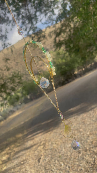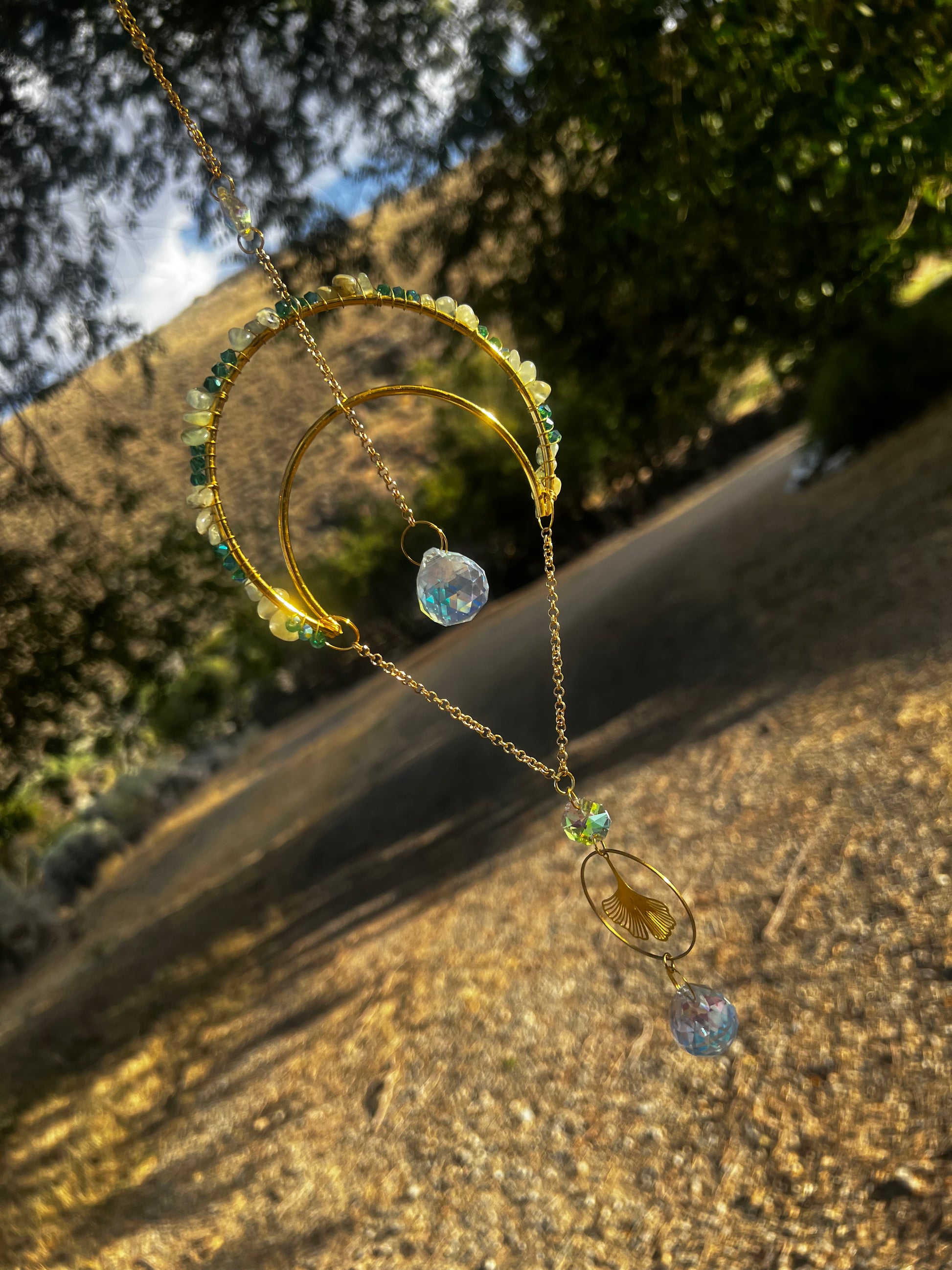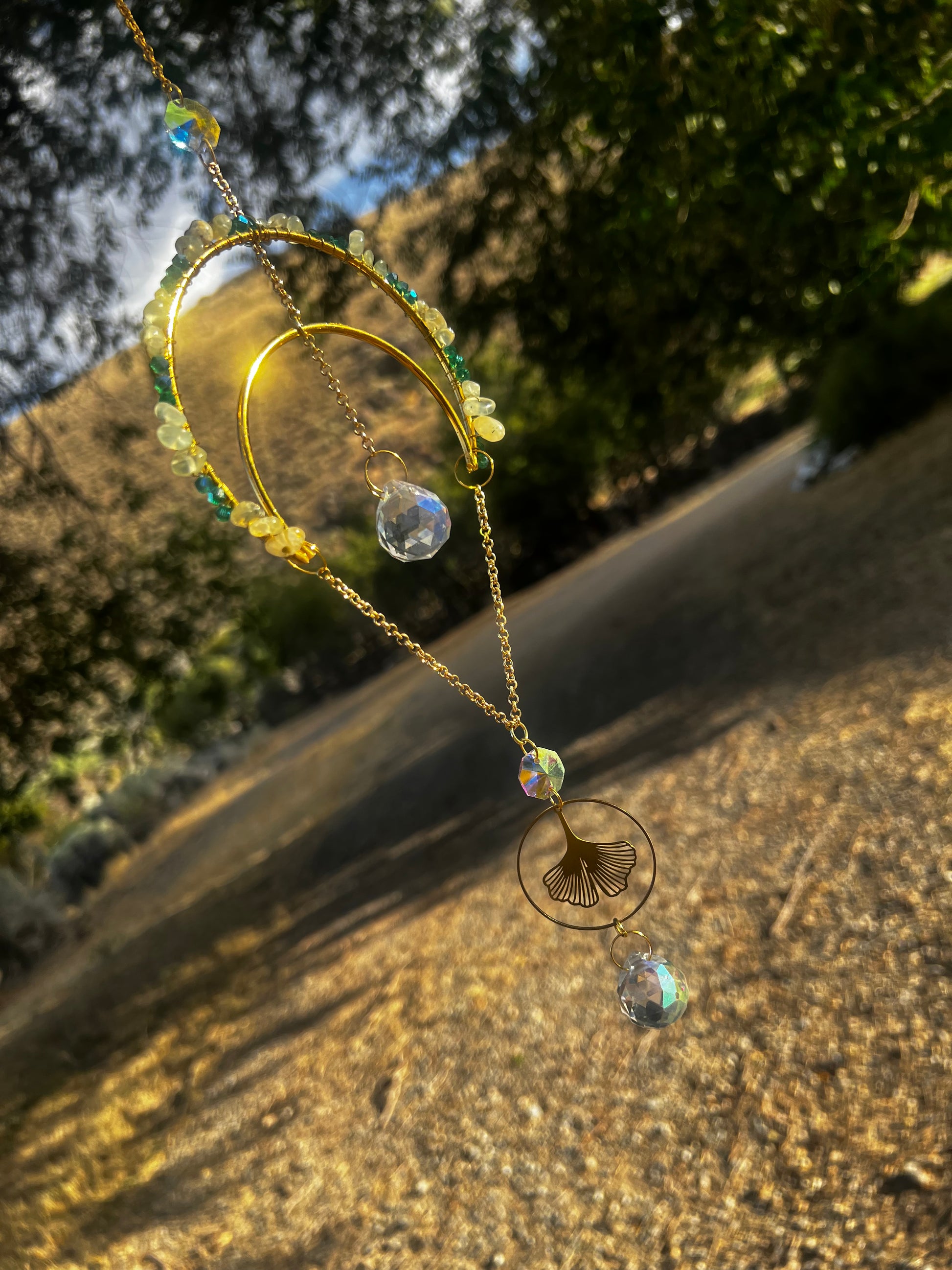 Light as a wish and grounded in grace, Filly dances between earth and air. Her golden twin hoops are wrapped in prehnite—stone of healing, intuition, and fresh perspective—shifting from soft green to misty aqua tones. A faceted prism catches the light at her center, while a ginkgo leaf charm below speaks of renewal and resilience.