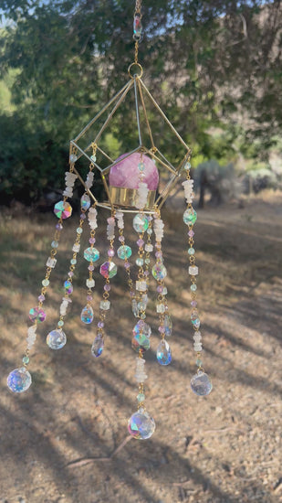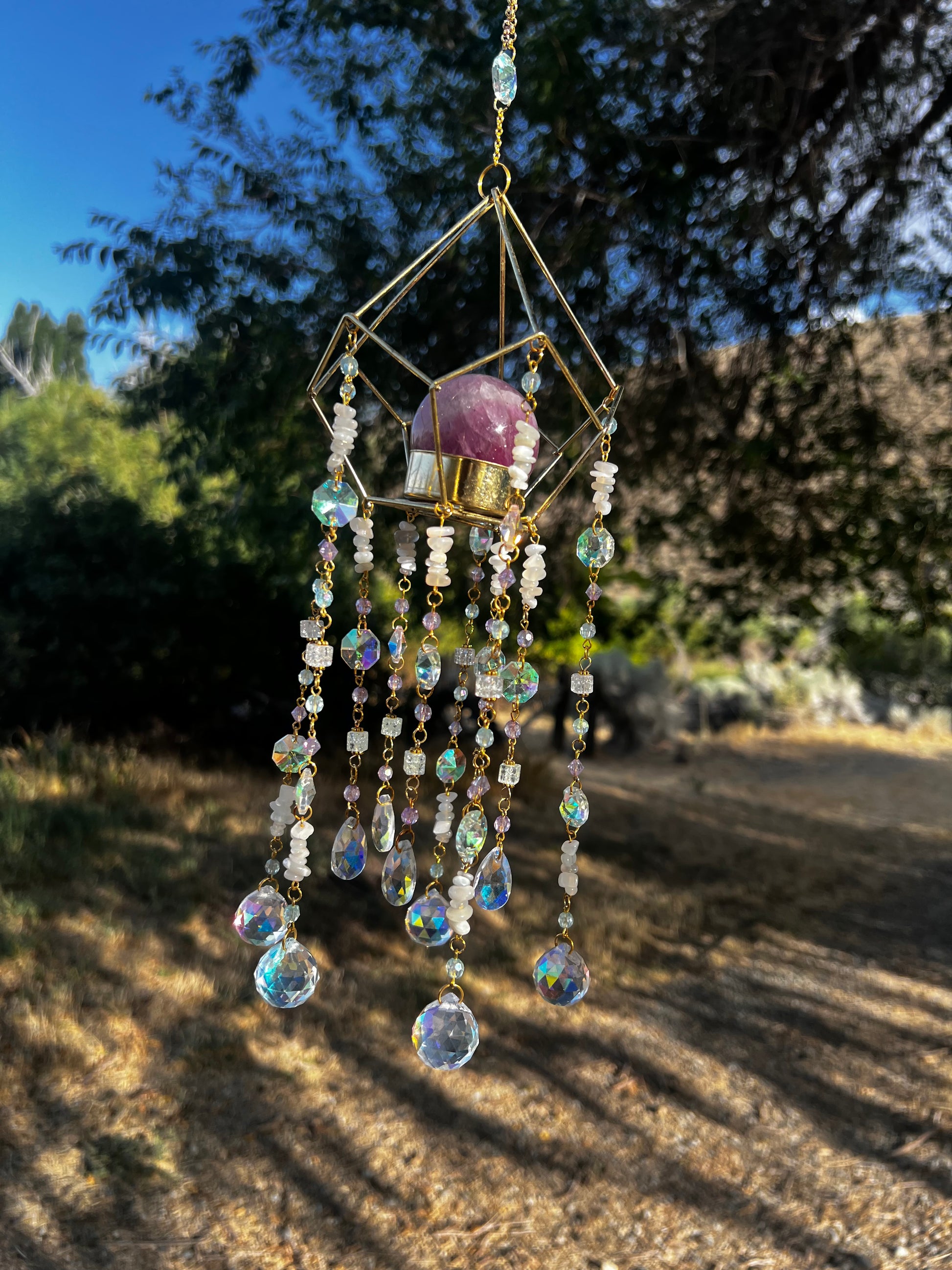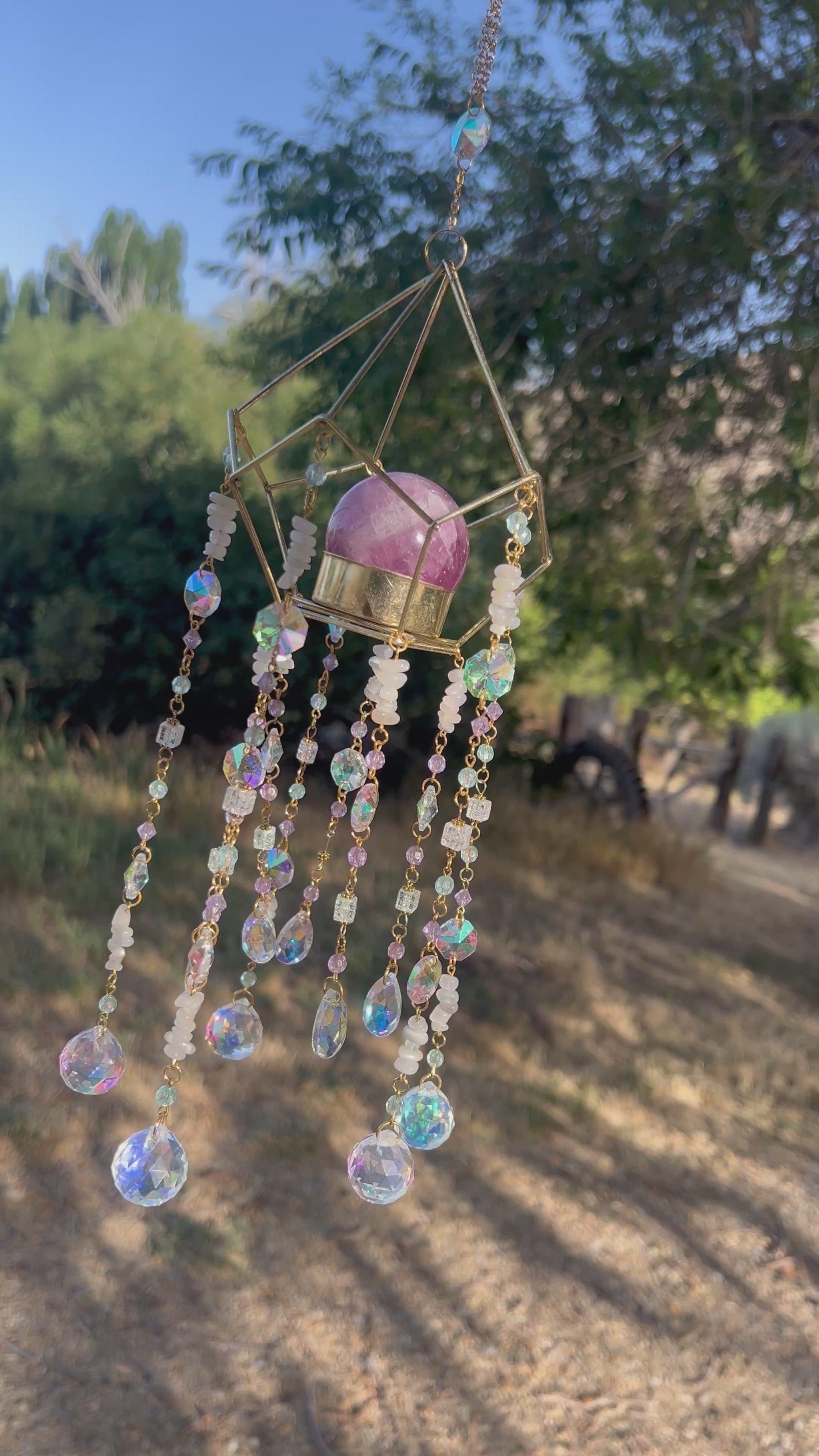 Delicate yet powerful, Josie floats like a cosmic jellyfish—soft, sacred, and radiant. A dreamy fluorite sphere is cradled inside a geometric golden cage, surrounded by cascades of white moonstone, crystal droplets, and iridescent beads that catch the light like underwater starlight. This piece dances with flow, emotion, and intuitive depth.