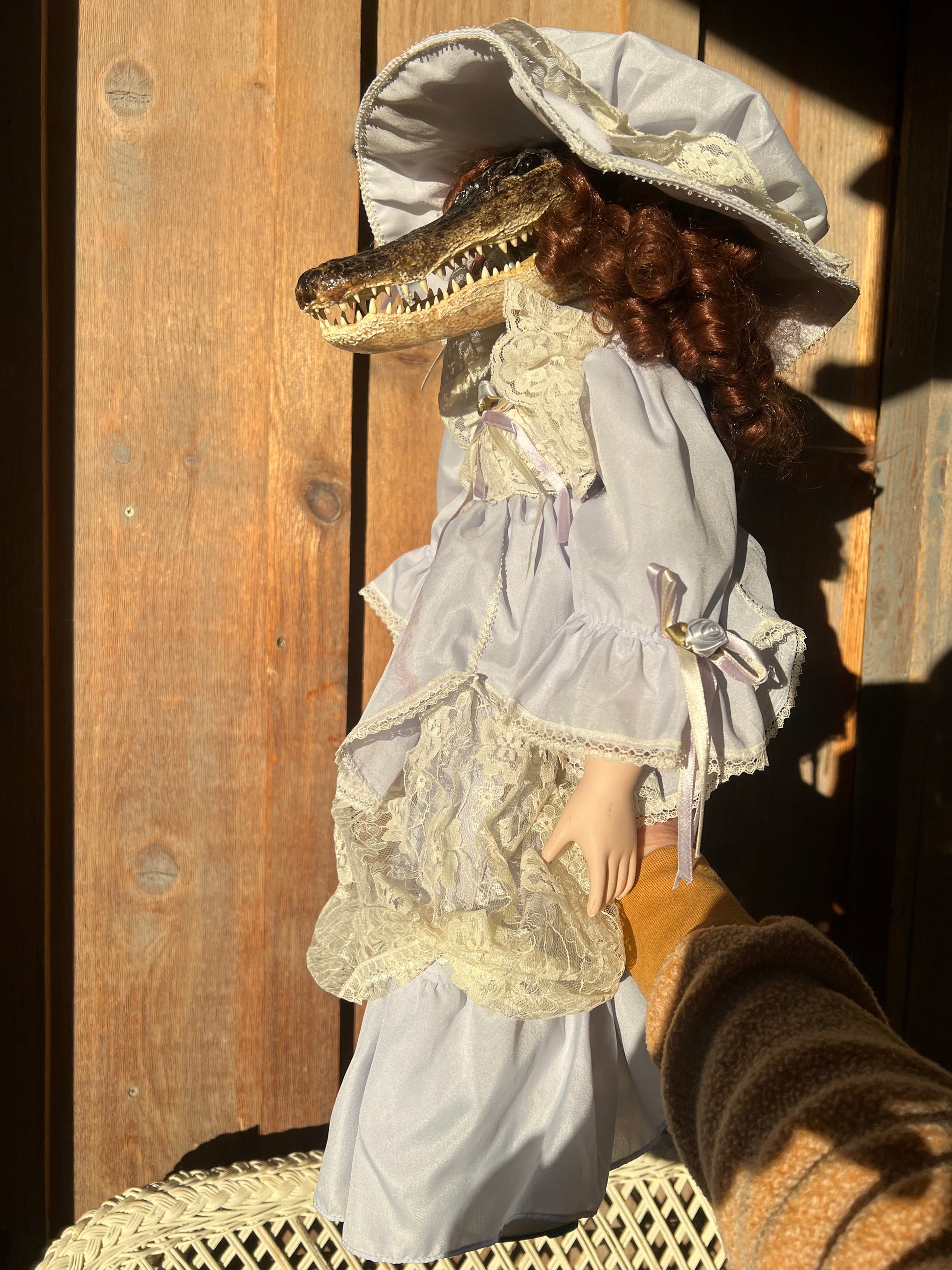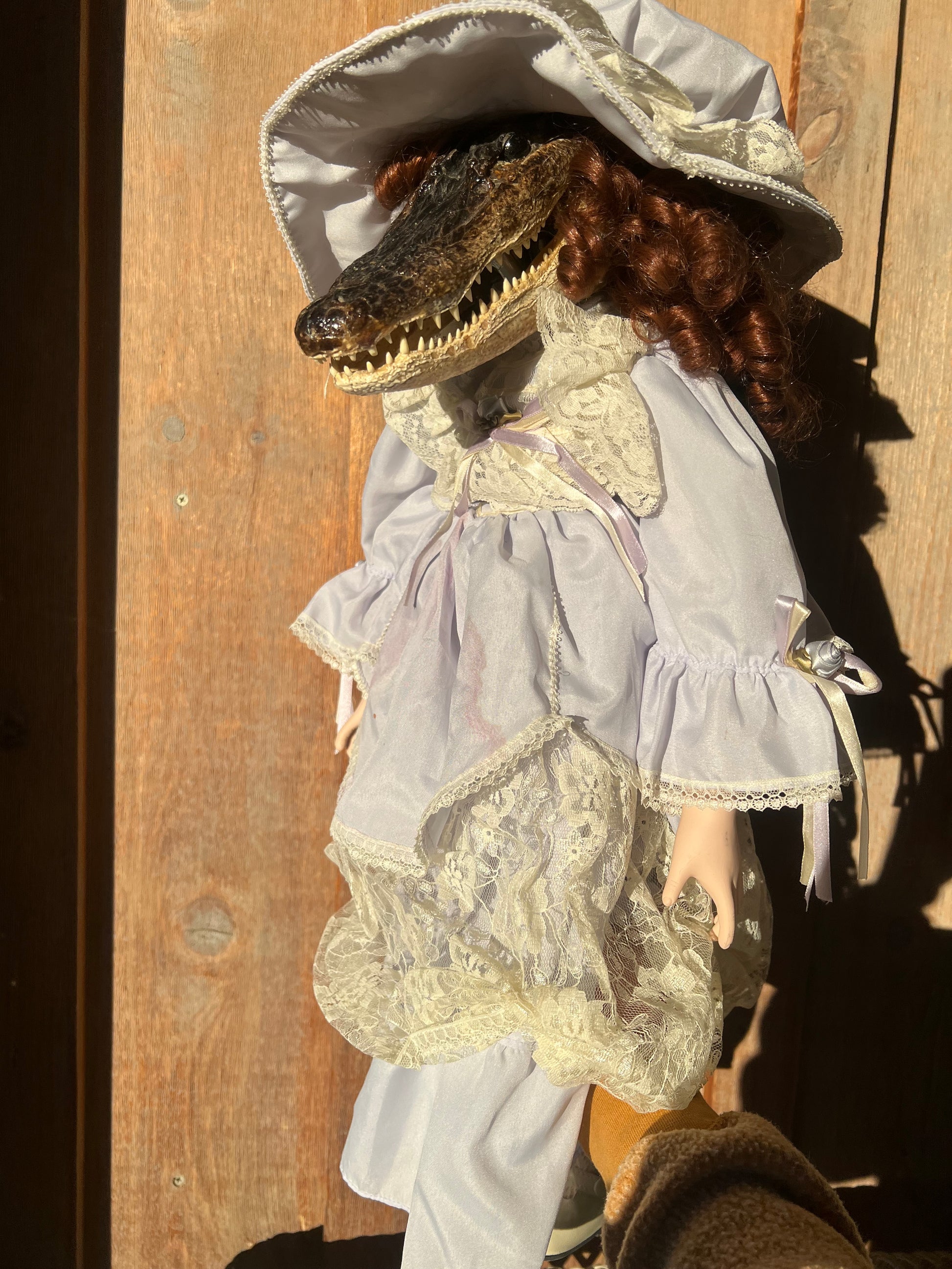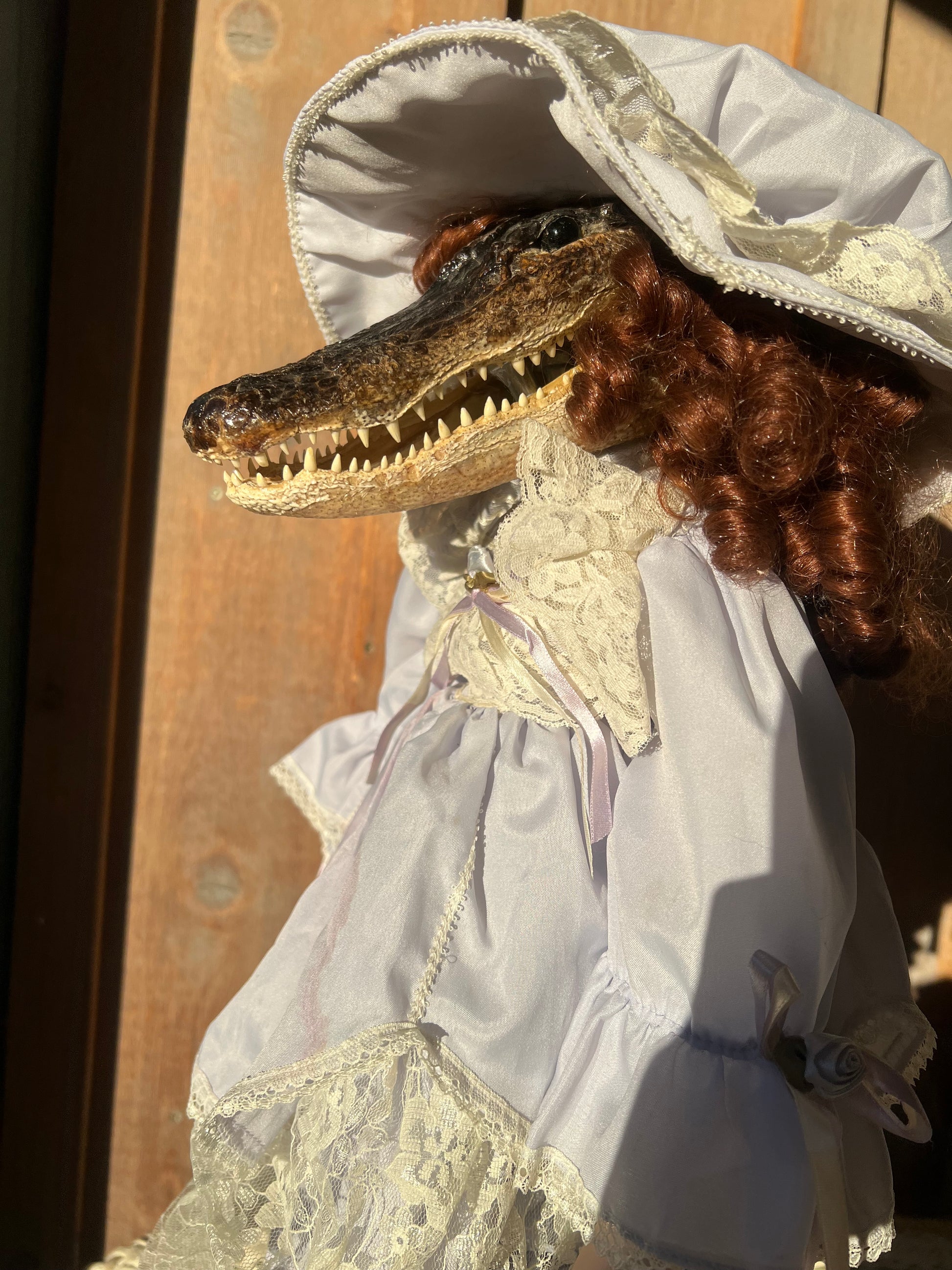 Every detail from her lace-trimmed bonnet to her perfectly preserved gator snout is lovingly handcrafted and ethically sourced. She stands proudly, ready to guard your home, your altar, or your emotional boundaries.