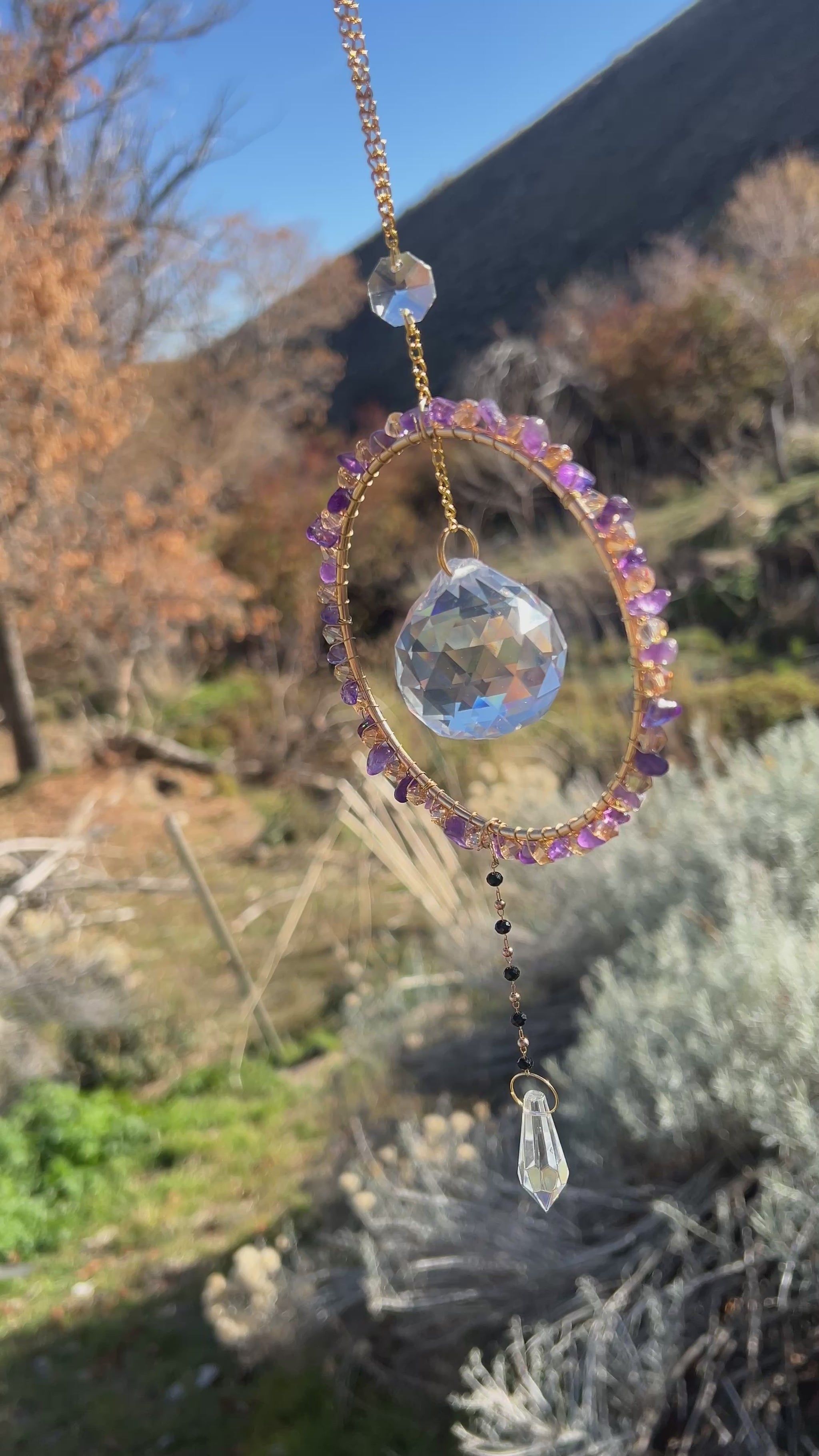 A golden halo is wrapped in alternating amethyst chips and amber acrylic beads, creating a natural gradient that glows like the sky shifting from lavender to gold. Suspended at the center is a faceted extra large prism that explodes with rainbows when the sunlight hits, while a delicate chain of dark beads leads to a final crystal drop, the perfect finishing note of shimmer and shadow.